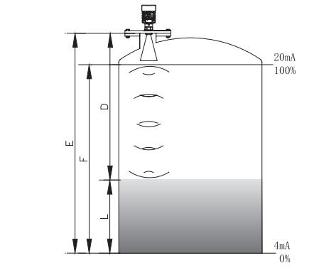 通過輸入空罐高度E(=零點(diǎn)),滿罐高度F(=滿量程)及一些應(yīng)用參數(shù)來設(shè)定,應(yīng)用參數(shù)將自動(dòng)使儀表適應(yīng)測量環(huán)境。對應(yīng)于4~20mA輸出。
