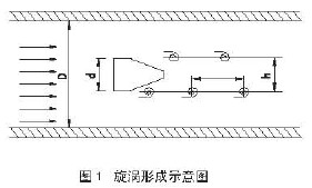 實(shí)驗(yàn)證明:當(dāng)兩列旋渦之間的距離h和同列兩個(gè)旋渦之間的距離L滿足L/h=0.281時(shí)非對(duì)稱旋渦列就能保持穩(wěn)定狀態(tài)。當(dāng)流體雷諾數(shù)Re在5000-15000之間范圍內(nèi)時(shí),Sr基本不變,所以d和Sr為定值時(shí)旋渦發(fā)生體的頻率f與流體的平均流速成正比,即與體積流量Q成正比而與壓力、溫度、密度等無關(guān)。