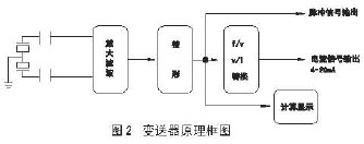 當(dāng)旋渦在柱體兩側(cè)產(chǎn)生時(shí)候,傳感器受到與流向垂直的交變升力的作用感生信號(hào),升力的變化頻率是旋渦頻率,傳感器將信號(hào)送轉(zhuǎn)換器放大整形后得到與流速成線性比例的脈沖信號(hào)直接輸出或?qū)⑵滢D(zhuǎn)換成4~20mA標(biāo)準(zhǔn)信號(hào)輸出,流量Q與頻率f的關(guān)系如下: 式中:Q=瞬時(shí)體積流量(升/秒) f-頻率(Hz) k-儀表常數(shù)(次/升)