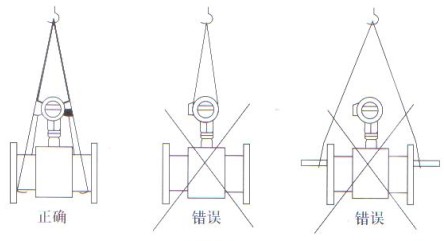 電磁流量計(jì)在搬運(yùn)和吊裝傳感器時(shí),應(yīng)該將吊索套在傳感器兩端頸部位置或吊環(huán)上,切勿在測(cè)量管內(nèi)套入管棒進(jìn)行吊裝,以免損壞襯里(見圖)。在吊裝和搬運(yùn)電磁流量計(jì)過程中,必須防止傳感器襯里和接線盒受碰撞而損壞。
