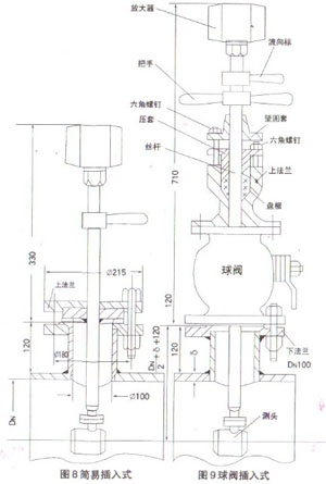 簡易插入式渦街流量計結(jié)構(gòu)見圖8,球閥插入式渦街流量計結(jié)構(gòu)見圖9,當(dāng)松動六角螺釘,轉(zhuǎn)動把手將測頭提高到球閥以上時,關(guān)閉球閥,實(shí)現(xiàn)不斷流檢修。 ![]() 插入式渦街流量計安裝特殊要求 1、 插入式渦街流量計安裝垂直度不大于±5° 2、 測頭應(yīng)插入被測管道的中心位置,其軸線偏離不大于0.02DN 3、 測頭軸線與被測管道軸線之夾角不大于±5° 4、 插入式渦街流量計流向標(biāo)與流體的流動方向應(yīng)一致。