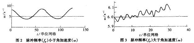 流量計(jì)產(chǎn)生誤差的主要因素是脈動(dòng)流的頻率,所加的正弦脈動(dòng)流的頻率與穩(wěn)態(tài)下渦輪的旋轉(zhuǎn)角加速度的關(guān)系為ω=2πfp(1/qm)r2時(shí),相應(yīng)曲線與輸入正弦曲線最為接近,與理論分析基本吻合,多次改變脈動(dòng)流頻率、振幅參數(shù),發(fā)現(xiàn)有時(shí)圖形失真非常厲害,通過對多幅圖形的比較,發(fā)現(xiàn)有如下規(guī)律:(見圖2、3)