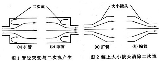 無論是變大還是變小,都會產生二次流動,干擾正常的流速分布。通常在遇到這類情況的時候,我們會為管道安裝合適的大小接頭,如圖2所示。為流體做合理過渡,使流速能夠恢復到正常狀態(tài),保證測量數據的準確與穩(wěn)定。