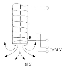 與一般污水流量計(jì)不同的是, 插入式污水流量計(jì)的傳感器是外側(cè)形成外發(fā)射磁場(chǎng), 測(cè)量電極在傳感器的端部或兩側(cè)如圖 2 所示,值得注意的是,外發(fā)射磁場(chǎng)電磁流速傳感器的感應(yīng)信號(hào)受流體和磁場(chǎng)的邊界層厚度影響, 會(huì)降低測(cè)量的線性度。