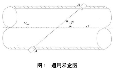 標(biāo)準(zhǔn)表法在線校準(zhǔn)是在大口徑電磁徑流量計(jì)所在管道上串聯(lián)一個(gè)精度較高的外夾式超聲流量計(jì)作為標(biāo)準(zhǔn)表,對(duì)在線的電磁流量計(jì)和前后連接管道、介質(zhì)流動(dòng)狀態(tài)等組成的流量測(cè)量系統(tǒng)的整體校準(zhǔn)。使流體在相同的時(shí)間間隔內(nèi)連續(xù)通過(guò)標(biāo)準(zhǔn)表和被校流量計(jì),記錄被檢表和標(biāo)準(zhǔn)表的流量值,以標(biāo)準(zhǔn)表示值作為標(biāo)準(zhǔn)值,計(jì)算被檢流量計(jì)的誤差。標(biāo)準(zhǔn)表超聲流量計(jì)測(cè)量流量是以測(cè)量聲波在流動(dòng)介質(zhì)中傳播的時(shí)間與流量的關(guān)系為原理。通常認(rèn)為聲波在流體中的實(shí)際傳播速度是由介質(zhì)靜止?fàn)顟B(tài)下聲波的傳播速度(C/)和流體軸向平均流速(νm) 在聲波傳播方向上的分量組成。按圖1所示,順流和逆流傳播時(shí)間與各量之間的關(guān)系是: