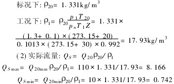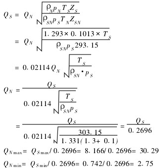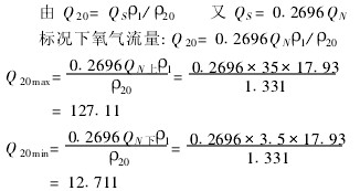 式中:ZS(ZSN)為被測氣體在標(biāo)準(zhǔn)狀態(tài)(工作狀態(tài))下壓縮系數(shù)(一般情況ZSUZSN);QS為工況下氧氣的實際流量;QN為標(biāo)況下空氣的實際流量;QN為標(biāo)況下空氣的密度(11293kg/m3);pN為標(biāo)準(zhǔn)大氣壓;TN為標(biāo)準(zhǔn)溫度293115K;QSN為標(biāo)況下氧氣的密度(即Q20);pS為氧氣實際工作壓力(即p1);TS為氧氣實際工作溫度(即T1)。