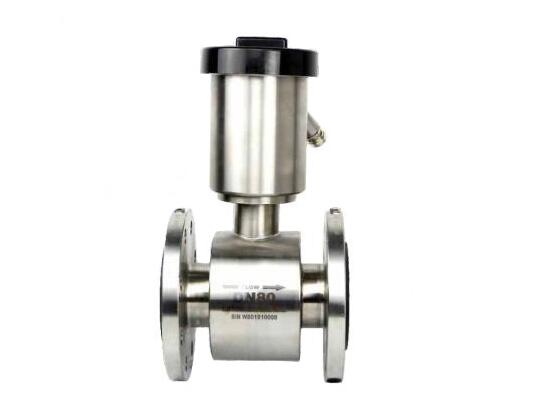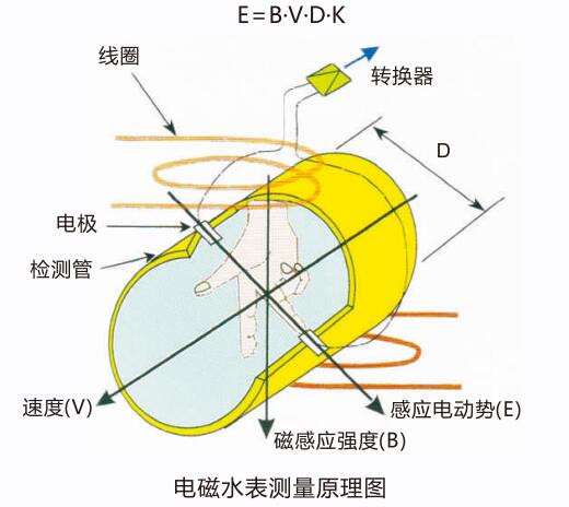 根據(jù)法拉第電磁感應(yīng)原理,在與測量管軸線和磁力線相垂直的管壁上安裝了對檢測電極,當(dāng)導(dǎo)電液體沿測量管軸線運(yùn)動時,導(dǎo)電液體切割磁力線產(chǎn)生感應(yīng)電勢,此感應(yīng)電勢由兩個檢測電極檢出,數(shù)值大小與流量成正比例,其值為: