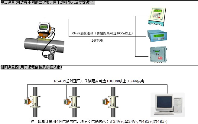 一次表與二次表(或計算機(jī))之間采用RS-485總線通訊,采用普通電纜即可,傳輸距離可達(dá)1000米以上,組網(wǎng)十分方便、快捷。這種傳輸方式抗干擾能力佳,解決了分體式超聲波流量計專用電纜成本高、抗干擾能力差、傳輸距離短等問題。