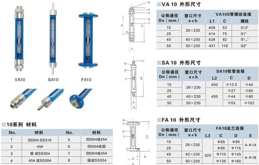 LZB-VA/SA/FA10系列玻璃轉(zhuǎn)子流量計(jì)與同類產(chǎn)品比較具有測(cè)量精度高,互換性好,連接方式多等優(yōu)點(diǎn)。連接方式有LZB-VA10管螺紋連接,LZB-SA10軟管連接,LZB-FA10法蘭連接(活套法蘭結(jié)構(gòu))。