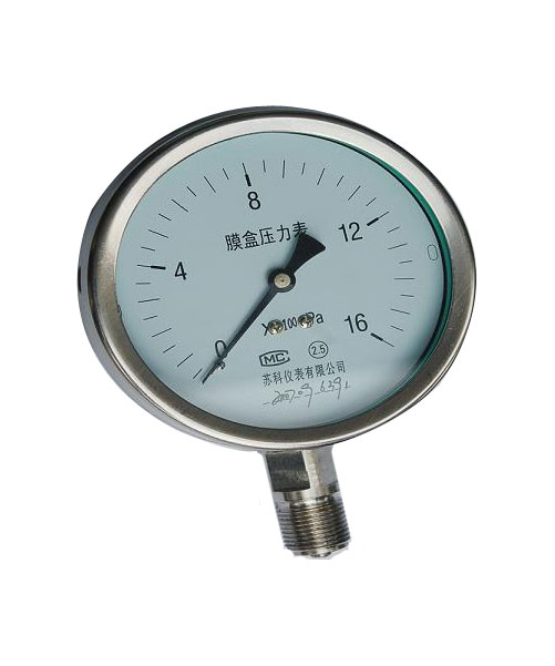 YE-100B、150B系列不銹鋼膜盒壓力表可測(cè)量有一定腐蝕性的氣體或液體的微小壓力。儀表的外殼及導(dǎo)壓系統(tǒng)采用1Cr18Ni9不銹鋼材料。